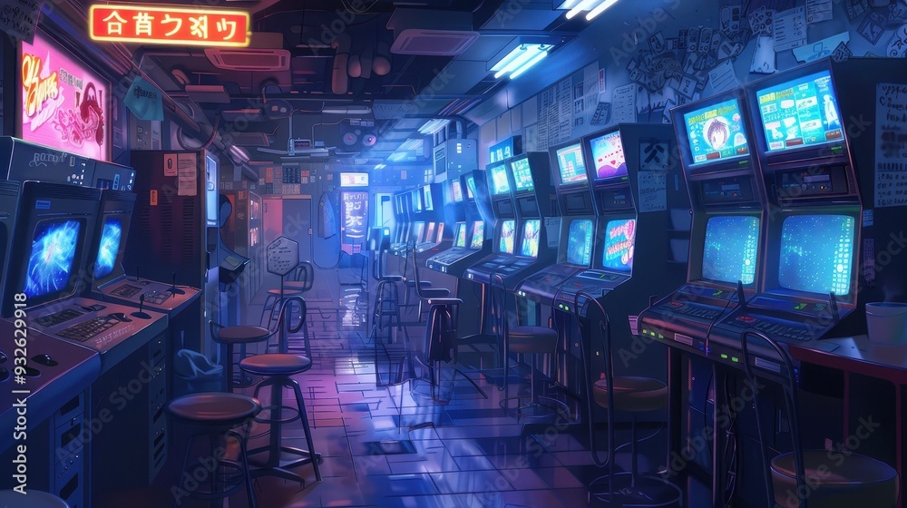 Patrons enjoy playing classic arcade games in a retro-styled anime gaming internet cafe buzzing with energy and colorful neon lights