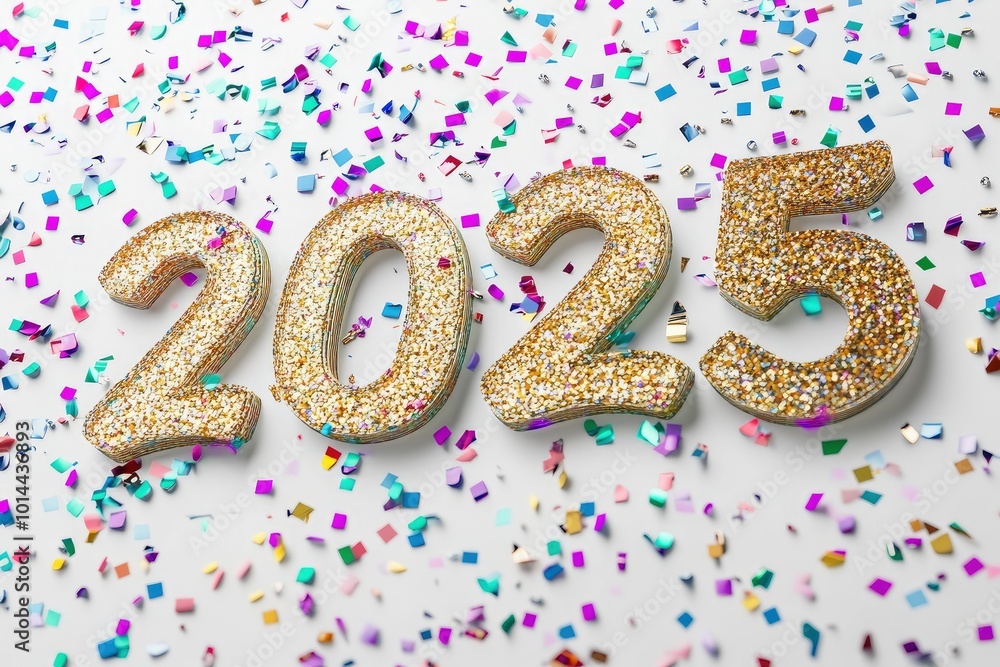 "2025" celebration with confetti - 3D rendering text on white background with generative ai