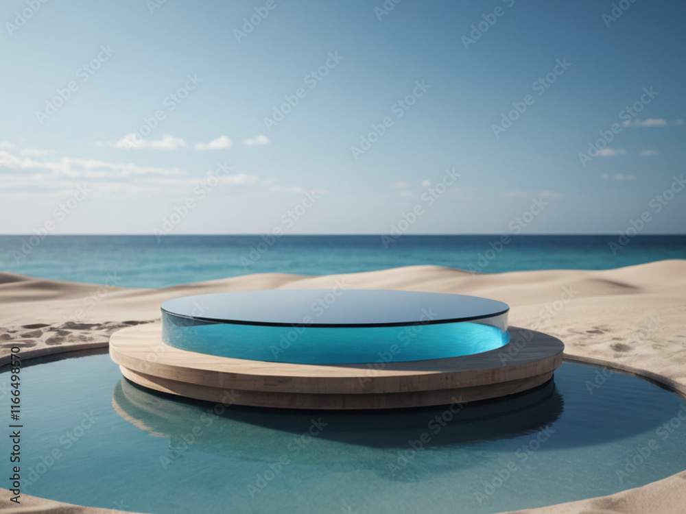 "3D Rendered Round Platform on Water and Sand with Glass Wall Panels: Minimal Landscape Mockup for Product Showcase in Blue Tones"
