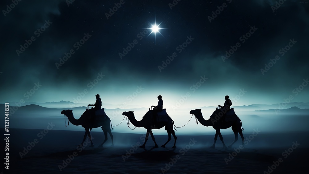 "Atmospheric Silhouette of Camels and Riders in a Dark Desert, Under a Starry Night Sky with Mist and Faint Mountains, Creating a Mystical, Tranquil Ambiance"