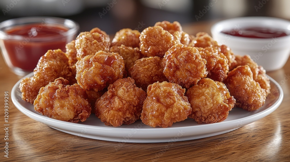 "Crispy Chicken Nuggets with Ketchup on Wooden Table: A Tempting Dark Background Delight"