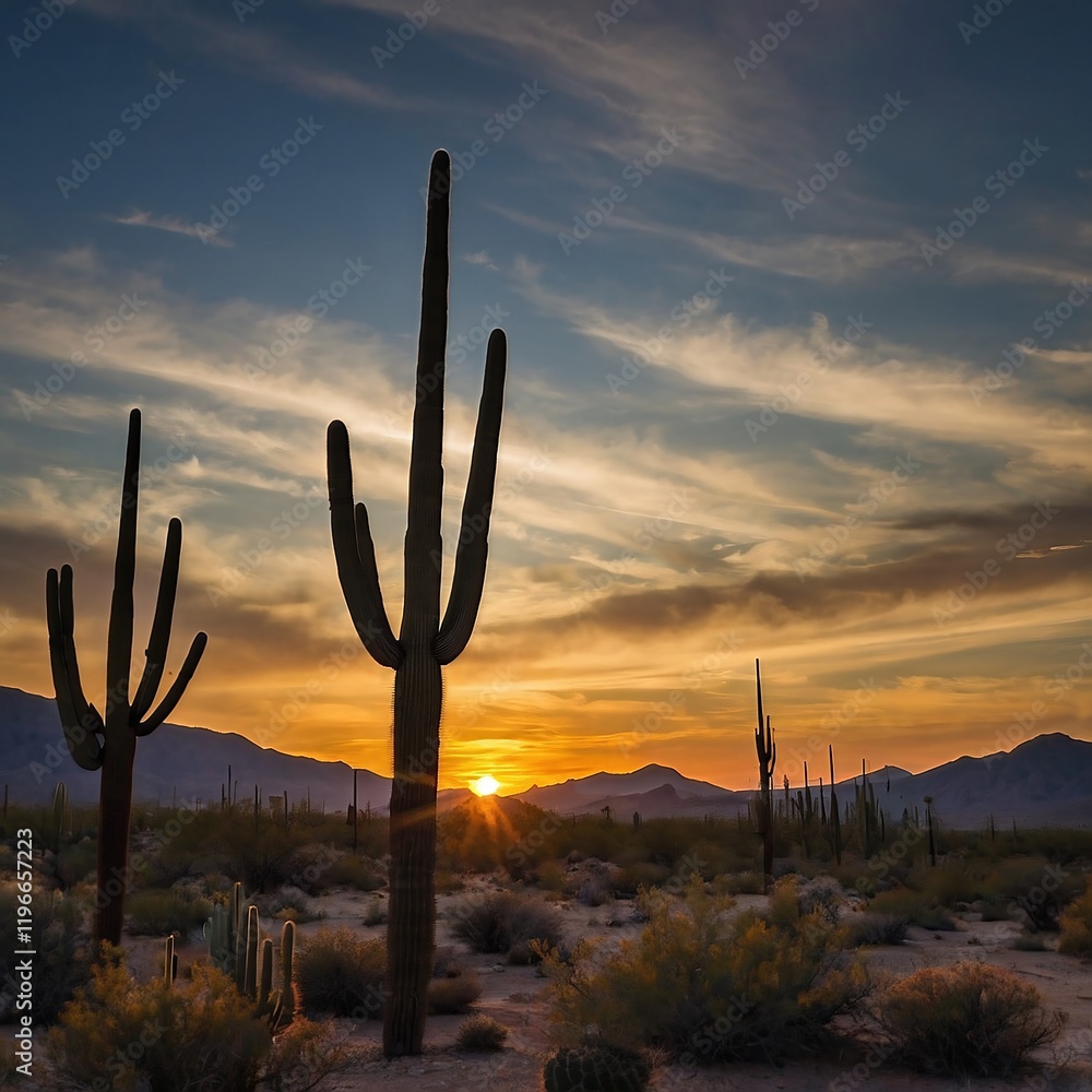 "Desert Sunset Photograph: Silhouette of a Saguaro Cactus Against a Dramatic Sky in the Sonoran Desert"