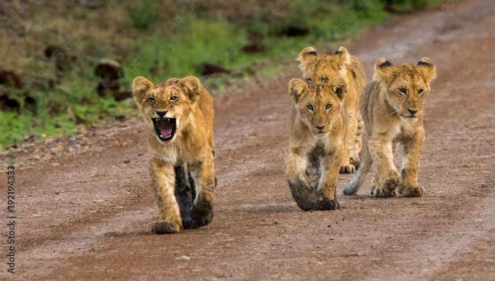 "Hup, Two, Three, Four!" It looks like this lion cub was calling out cadence as his pride strolled down this dirt road in Masai Mara National Park in Kenya.