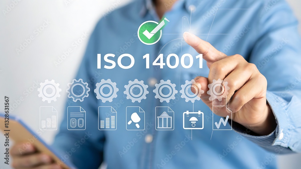 "ISO 14001 Environmental Management: Professional in Blue Shirt Interacting with Transparent Interface Showing Icons of Sustainable Practices"