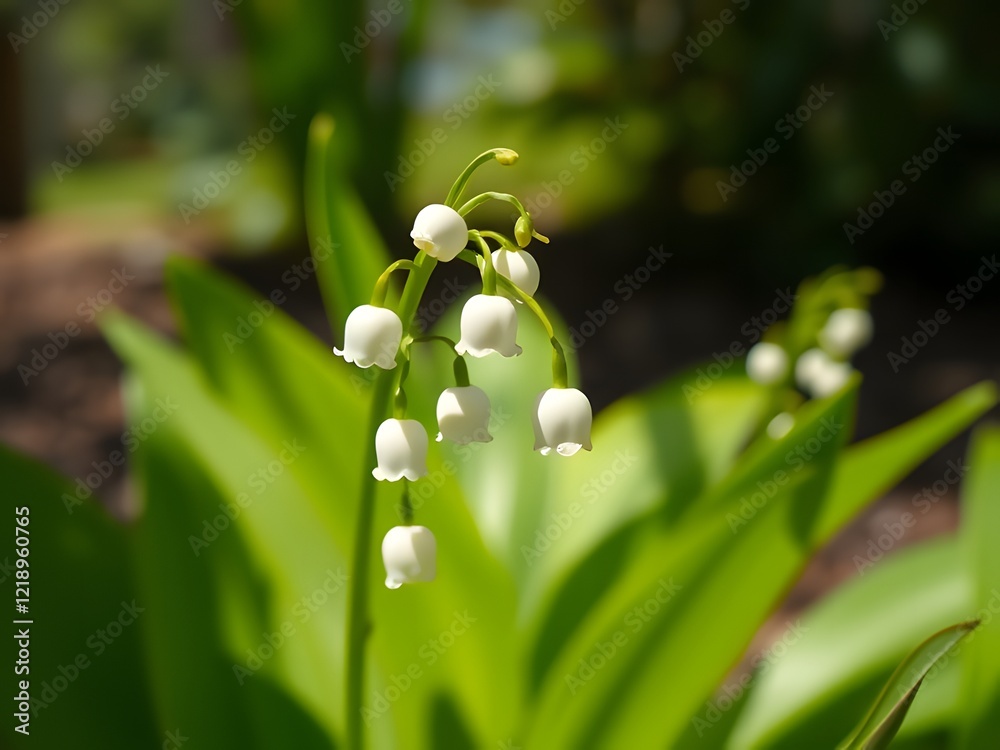 "Lily of the Valley Blooming in Shaded Garden with Glowing White Flowers and Blurred Background in 4K"