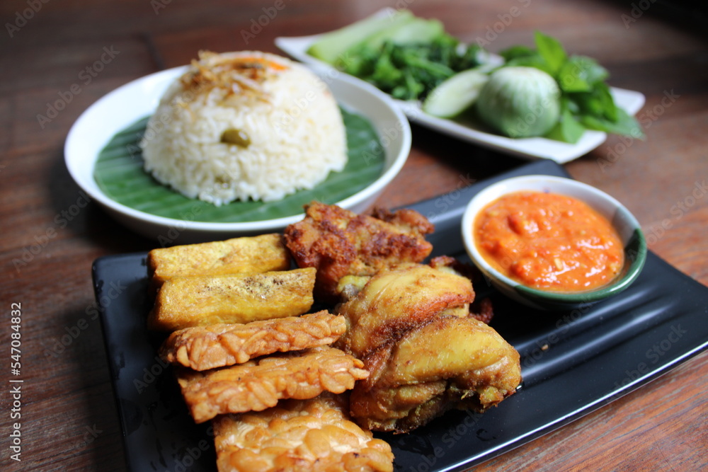 "Nasi Liwet" one of traditional food from Sunda, West Java, Indonesia. Served with vegetable or lalapan, chilli sauce, fried tempe, fried tofu and fried chicken. Wooden background.