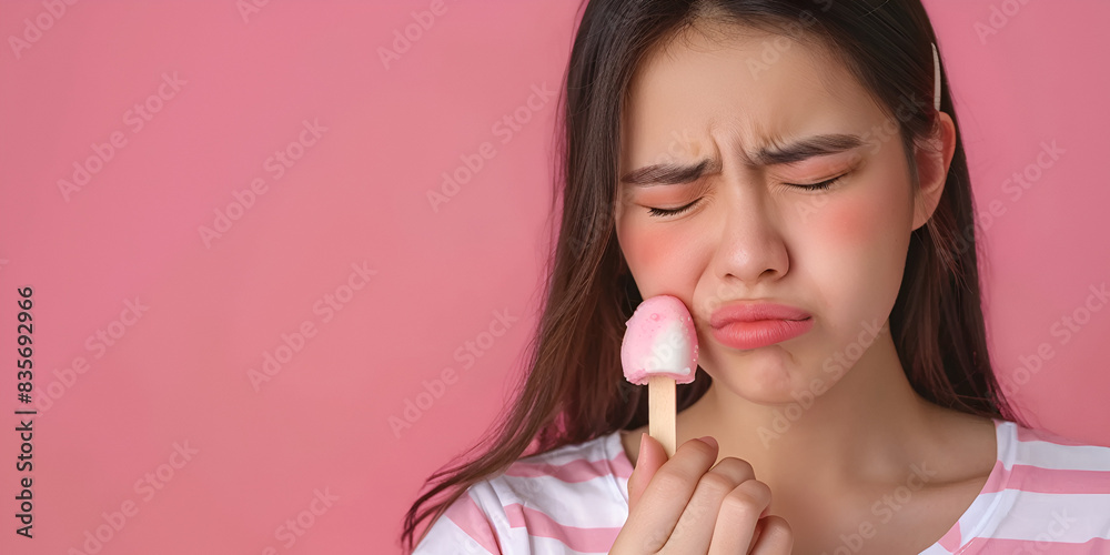 "Sad Girl Holding Melted Ice Cream | Disappointed Young Woman with Ice Cream on Pink Background"