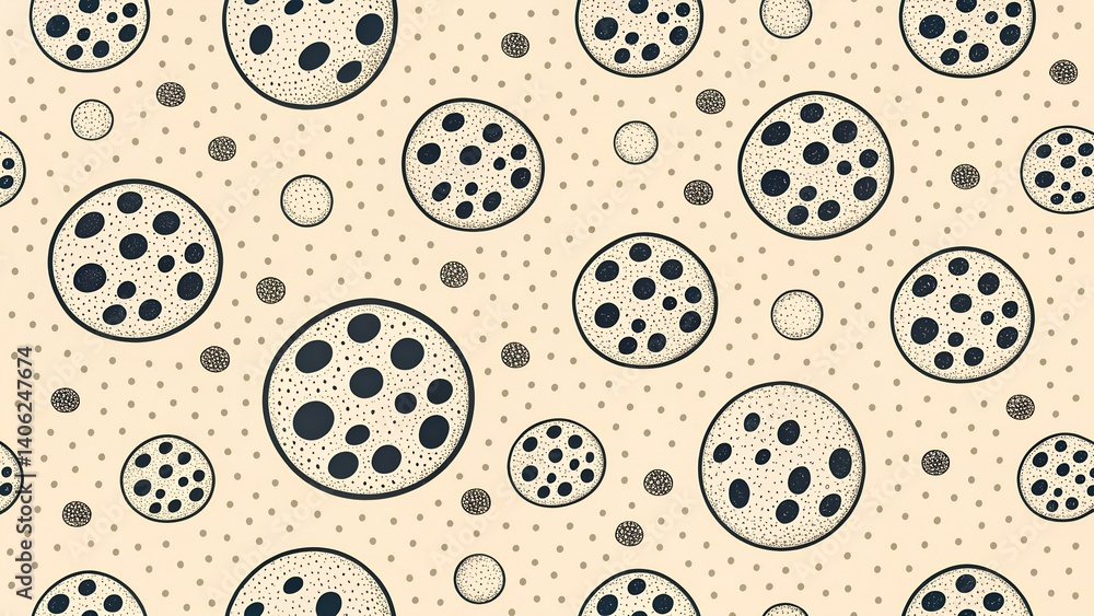 "Seamless pattern of hand-drawn polka dots in imperfect ink style, black on beige"