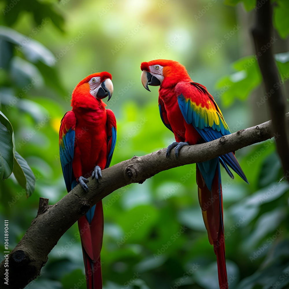 "Vibrant Scarlet Macaws in the Wild – Stunning Red, Blue, and Yellow Parrots Perched in Tropical Forest"