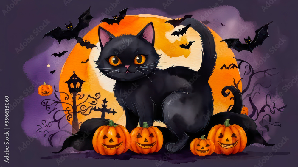 Black cat and jack-o'-lantern pumpkins with bats and Halloween decorations. Watercolor illustration with Happy Halloween text. Halloween celebration. Design for greeting card, poster, invitation