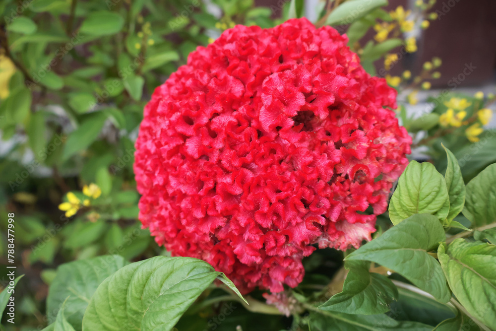 Bright red celosia cristata flowers on the tree behind a brown fence.