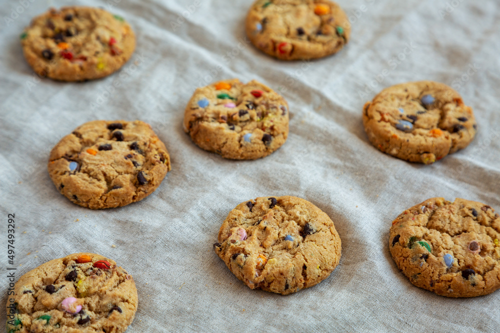 Homemade Chocolate Chip Candy Cookies, side view.