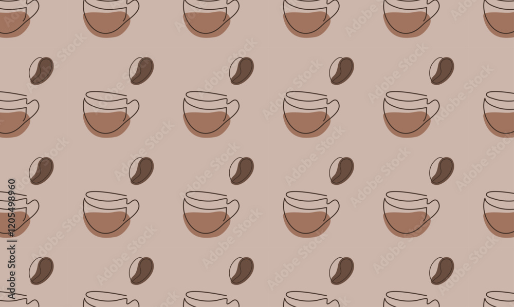 Seamless pattern with coffee beans and cups on the background of the fashionable color of 2025. Linear vector style. For fabric design, background, cover, packaging